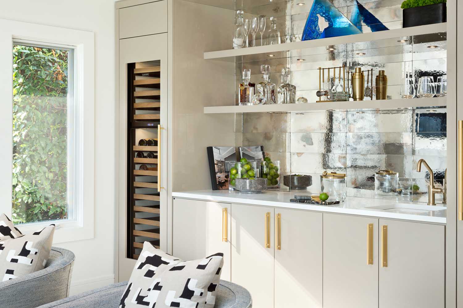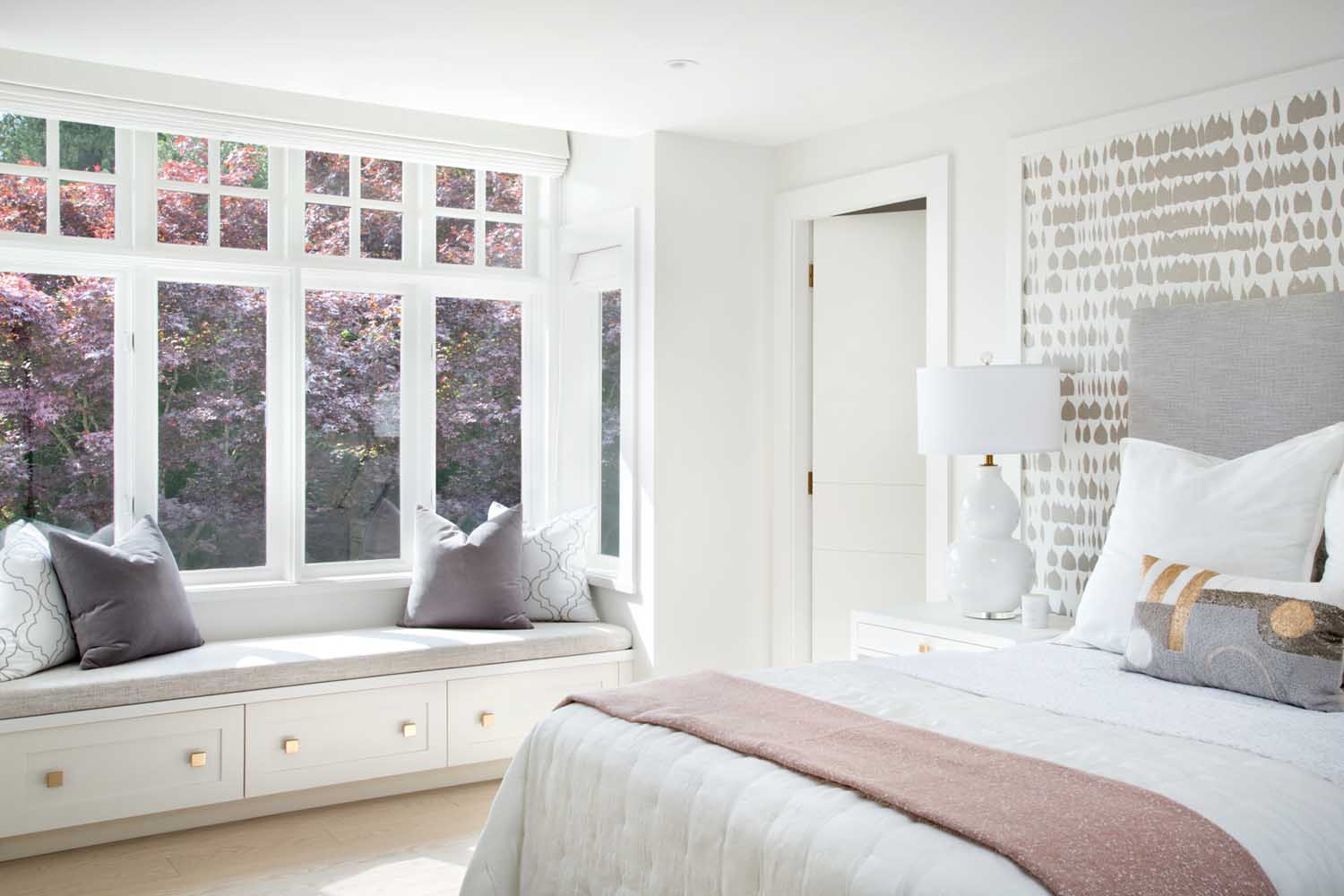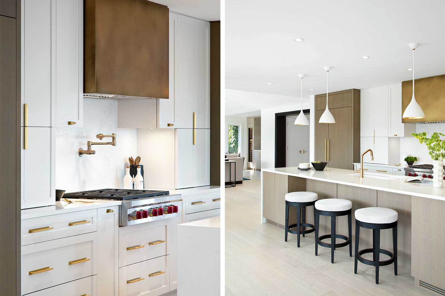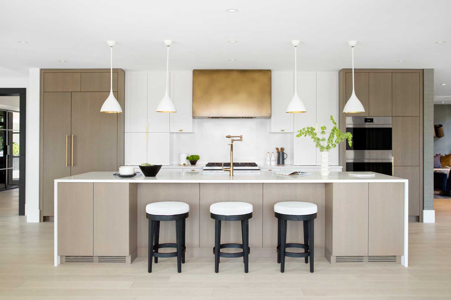 我們會(huì )在在項目開(kāi)始時(shí)與客戶(hù)充分溝通,深入的了解他們希望在新家中看到什么。我們從他們的藝術(shù)收藏中中汲取了很多靈感,我們使用了強烈的圖案和顏色,材質(zhì)的運用也是我們設計的關(guān)鍵,因此我們將白橡木櫥柜與大理石、金屬拉絲的五金和整個(gè)墻面使用的紋理墻紙等飾面相搭配,營(yíng)造出一種視覺(jué)的沖擊力。